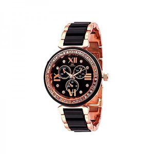 - Watch Display Type: Analogue, Movement: Quartz, Dial Color: Black, Dial Material: Brass, Dial Shape: Round, Dial Glass Material: Glass, Case & Band Material: Metal, Case & Band Color: Black & Rose Gold,<br>